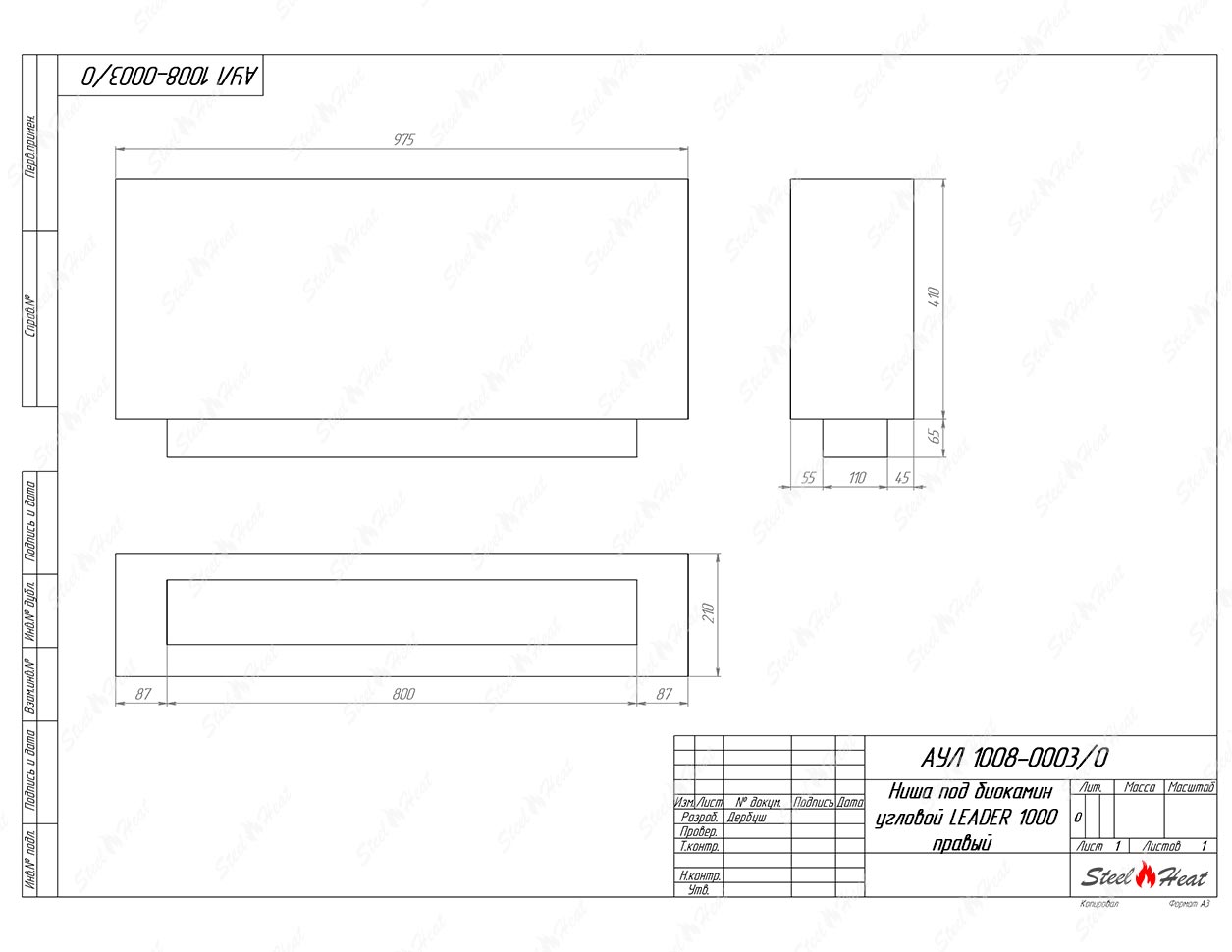 Встраиваемый Биокамин угловой SteelHeat Leader 1000 правый предназначен для встраивания в глухие ниши из гипсокартона, кирпича, пеноблоков, бетона.